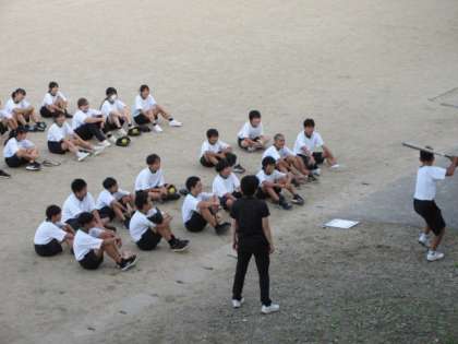 保健体育は、ベースボール型の球技、ソフトボールの授業です。野球経験者の素振りをお手本にして、これから実践するところでした。