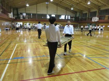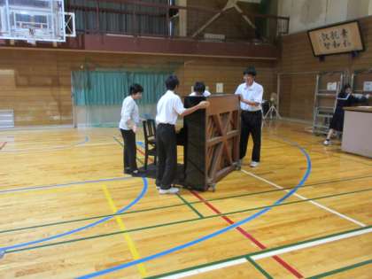 ピアノや階段も運んで、会場が整っていきます。