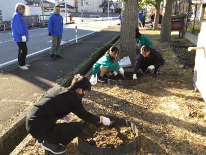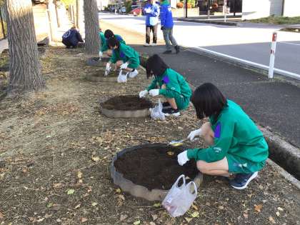 本日朝8:00から本校生徒11名+教員が、大広田花の道づくり活動に協力しています。チューリップの球根を、等間隔に植える活動をしています。