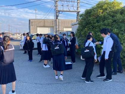11/12(火)2年生校外学習 公開日 2024/11/12 更新日 2024/11/12 第2学年 本日2年生は、金沢で校外学習を行います。金沢への移動はあいの風鉄道を利用するので、東富山駅に集合です。集合時刻までもう少しですが、生徒は集まり始めています。お天気が良くて、よかったです。