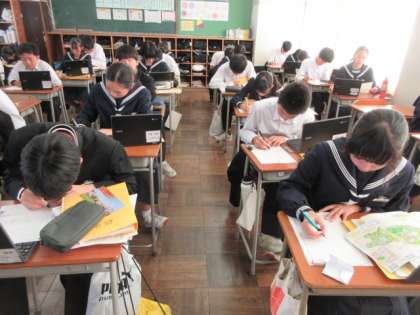 11月13日(水) 授業の様子(2学年) 公開日 2024/11/13 更新日 2024/11/13 第2学年 2年生は、昨日の校外学習のまとめを行っていました。パンフレット等の資料やしおりを見ながら、まとめていました。廊下に掲示する予定ですので、保護者懇談会の際にご覧ください。