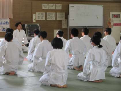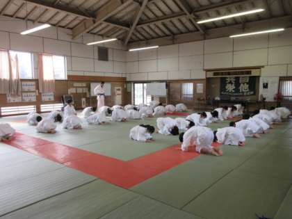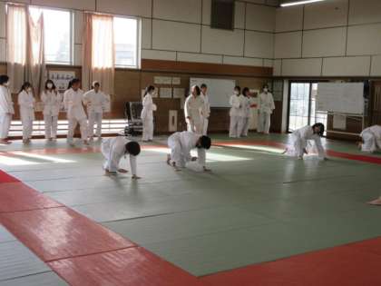 保健体育の柔道の様子です。挨拶の姿が、しゃきっとしています。前回り受け身の練習の様子です。