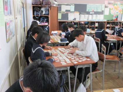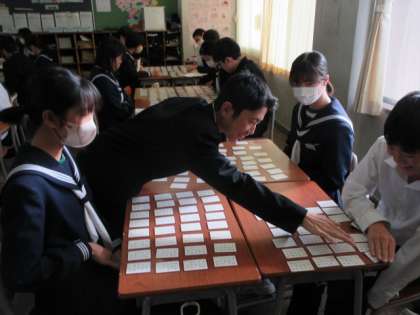 12月3日(火) 授業の様子(2学年) 公開日 2024/12/03 更新日 2024/12/03 第2学年 国語の授業の様子です。百人一首に挑戦していました。「先生、もう1回読んでください!」と言いながら、楽しく取り組んでいました。
