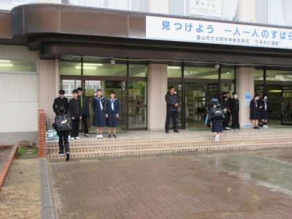 生徒が登校してきました。今日は、気温があまり上がらないそうです。