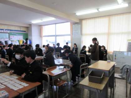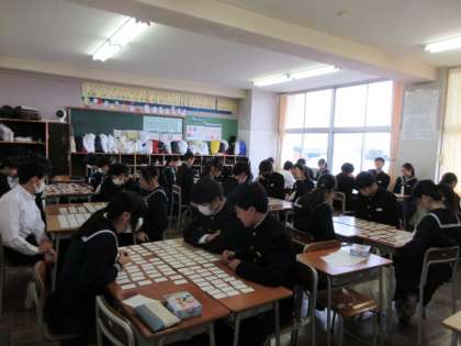 国語の授業の様子です。百人一首に取り組んでいました。国語の時間には、どの学年も書き初めや百人一首といった、日本の伝統文化に触れ、学習しています。