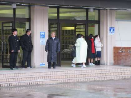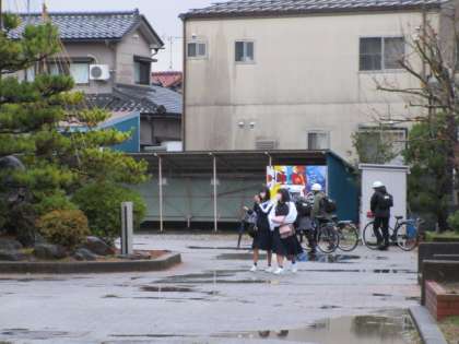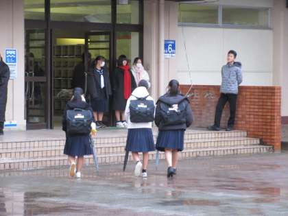 登校して、玄関で校長先生と話をする生徒が多いです。よい時間です。