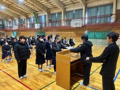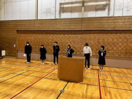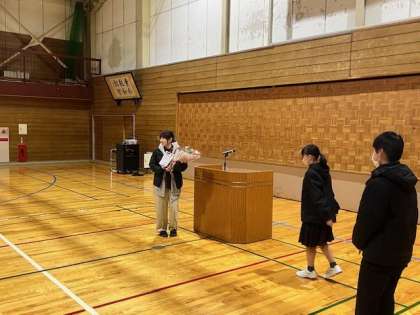 学年集会を行いました。各クラスの振り返りを級長が発表しました。また、美術作品コンテストの表彰式を行い、ポスター部門3名、螺鈿(らでん)八角箱部門3名が受賞しました。最後に、10月からお世話になった二川先生とのお別れの会を行いました。二川先生、今まで本当にありがとうございました!