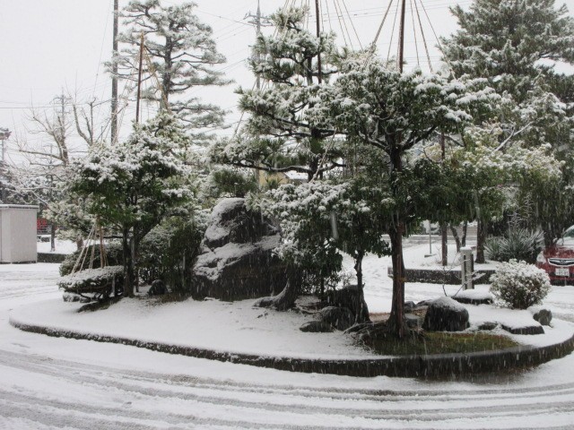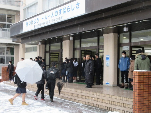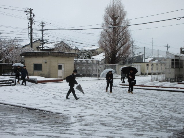 3学期の始まりです。雪が降る朝になりました。久しぶりに会って、会話が弾んでいるようです。