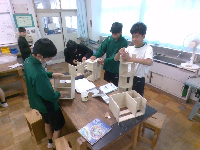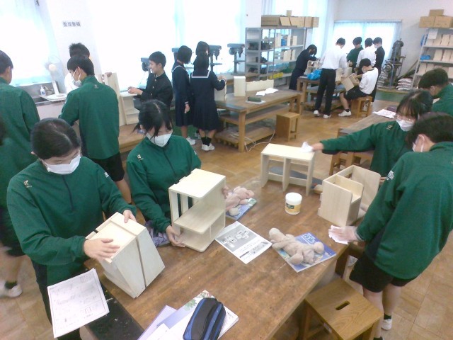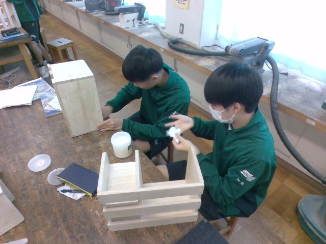 4限技術・家庭科(技術分野)では、木製品を製作しています。現在、仕上げの工程(下地づくり、塗装)に取り組んでいます。