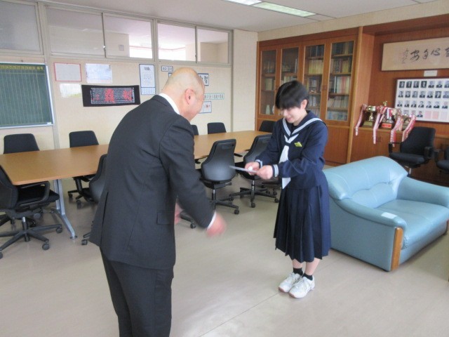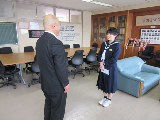 菅公杯バレーボール大会で県3位になり、北信越大会に出場する女子バレーボール部の部長に激励金を渡しました。練習の成果を十分に発揮して、来年度の全国大会につながるよう頑張りますと決意を表明しました。頑張れ、北中生!