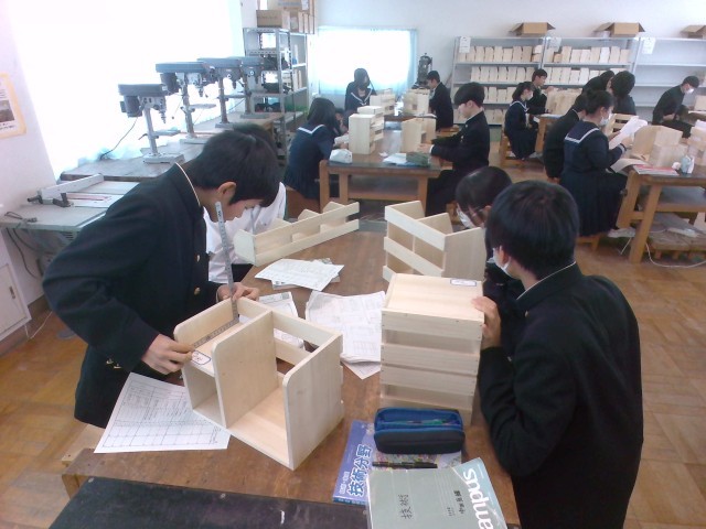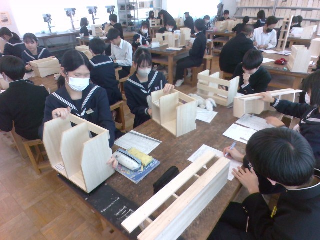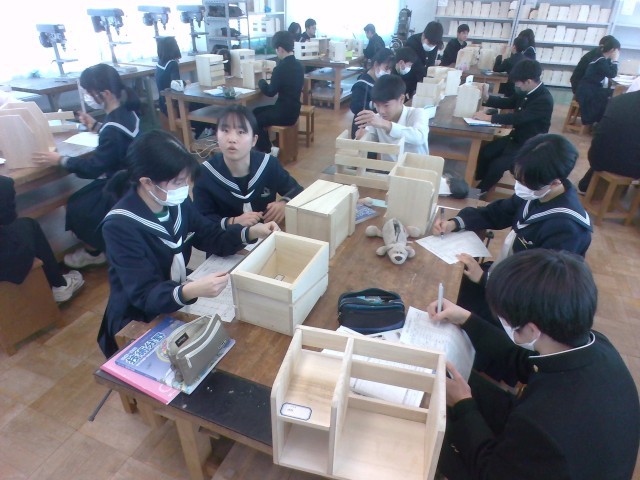 現在、技術・家庭科(技術分野)では、木製品の製作を行っています。すてきな製作品が完成しました。今日の授業は、製作品の評価です。製作品は、3月に持ち帰ります。家庭で大切に使ってほしいものです。