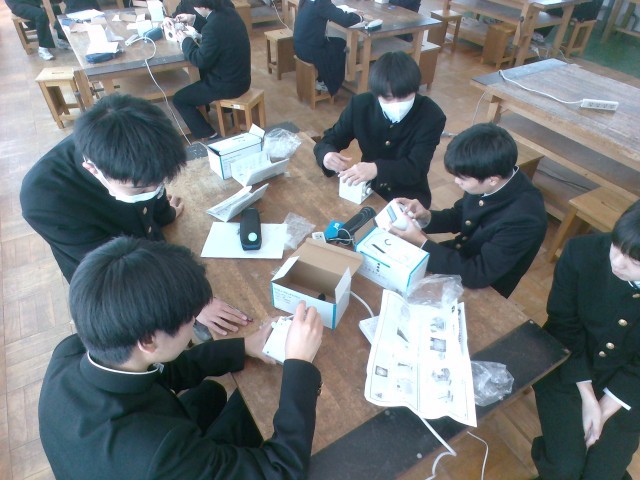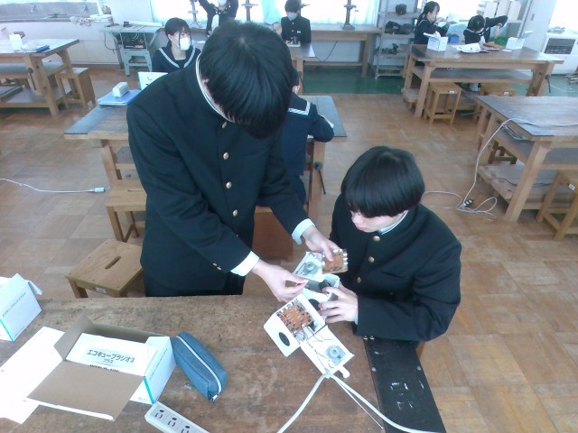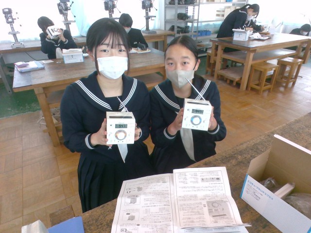 技術・家庭科(技術分野)では、発電機能付きのラジオを製作しています。みんなで協力して製作し、今日で作業が終わりました。