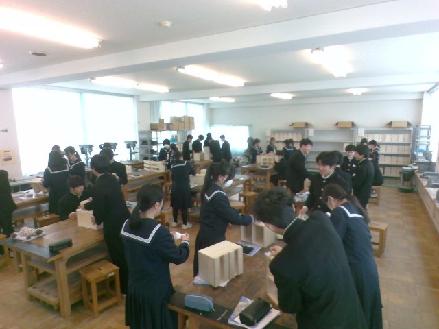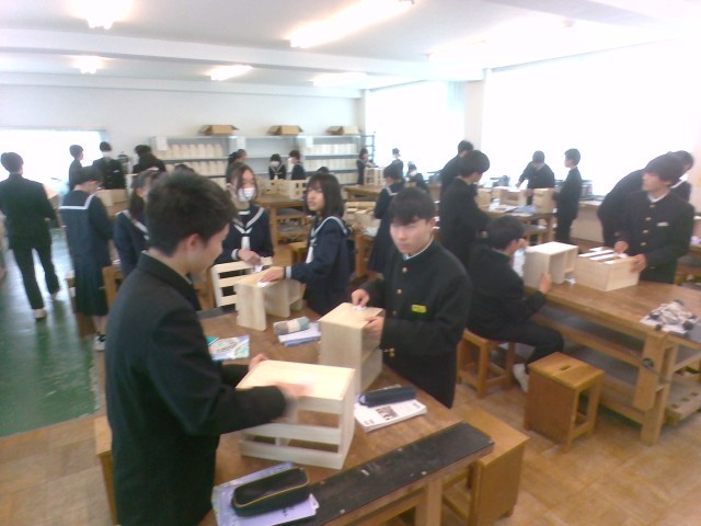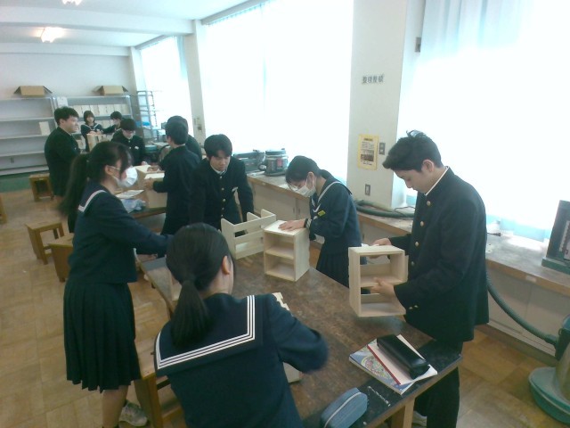 技術・家庭科(技術分野)では、木製品の製作を行っています。今日は、仕上げの工程でした。すてきな製作品が完成しましたね。