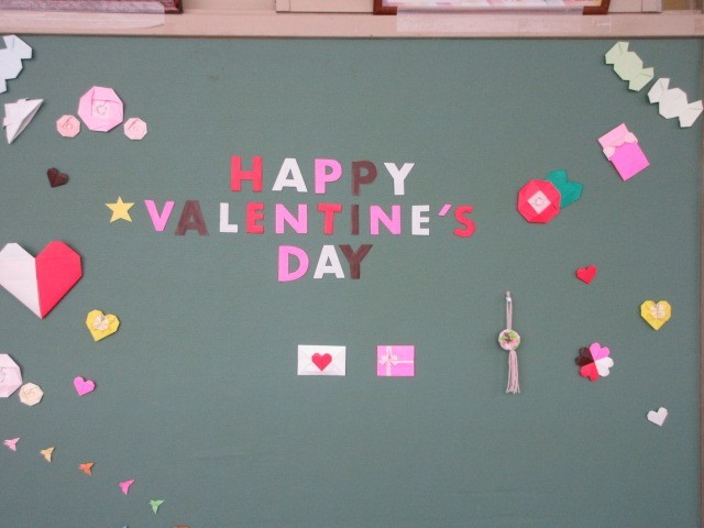 掲示板がバレンタインデーバージョンに変わりました。優しい色遣いで、仕上がっていました。手先が器用だなあと感心です。