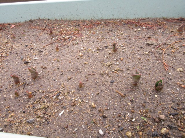 雪がとけ、チューリップの芽が顔を出しました。しかし、また、雪の予報が出ていますね。