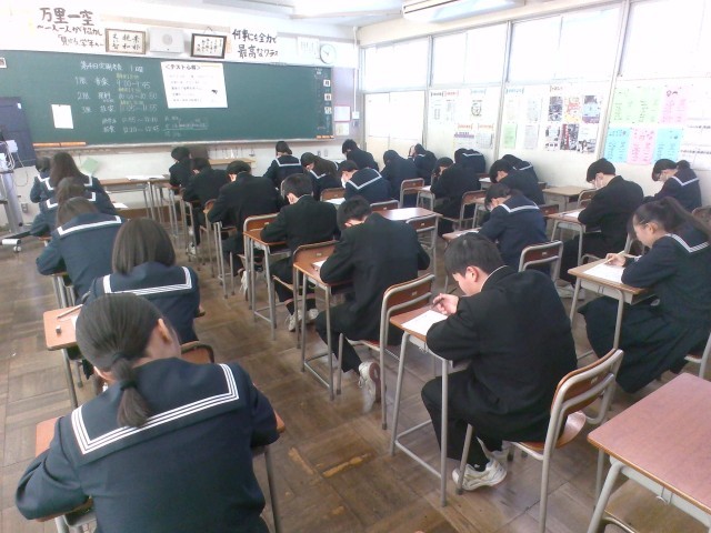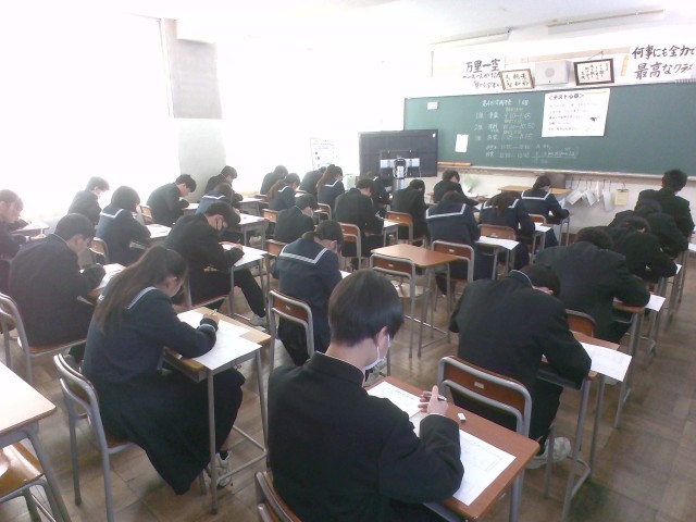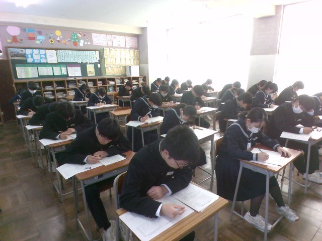 2限目は、理科です。今回の試験範囲は、電気と気象です。頭を悩ませながら計算をしたり、天気図を見たりしながら解いていました。