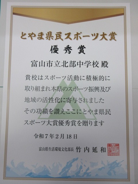 とやま県民スポーツ大賞とは、県のスポーツの普及・振興に尽力した個人・団体及びスポーツを通じた地域の活性化や子供の体力向上に貢献した個人・団体の功績を称え、生活環境文化部長から贈呈されるものです。この度、北部中学校が 地域活性化部門の部 優秀賞を受賞しました。ありがとうございます。