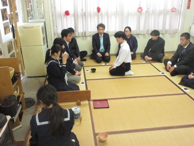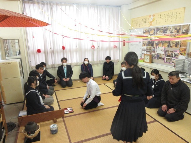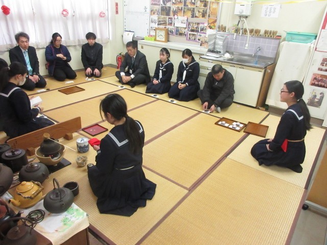 放課後、卒業茶会を行いました。ふだんお世話になっている先生方や3年生の先輩を招き、お手前を披露しました。