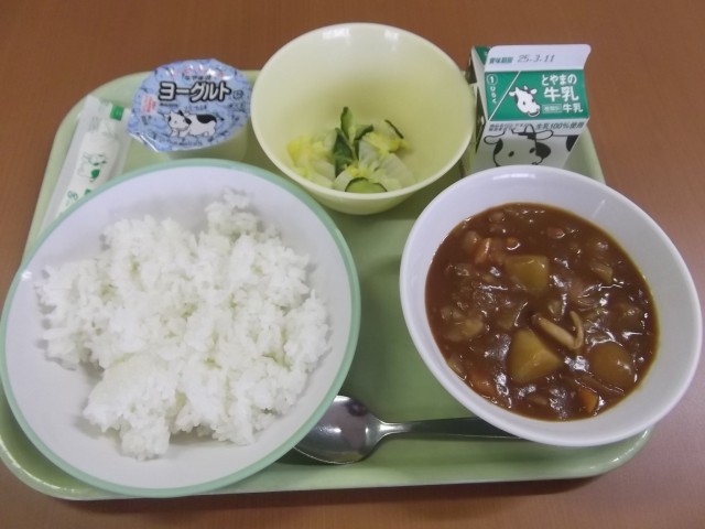 3/4(火)今日の給食 公開日 2025/03/04 更新日 2025/03/04 給食 今日は、給食の人気献立「ハヤシライス」の日です。3年生にとっては、残り少ない給食で、ハヤシライスの提供はとっても嬉しいのではないでしょうか。「ハヤシライスだぁ」と楽しげにはやし立てる声が聞こえてきそうです。<今日の献立> ごはん 牛乳 たべキリンハヤシ 白菜サラダ ヨーグルト