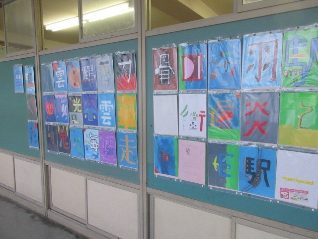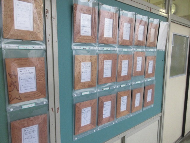 教室前に美術の作品を掲示しています。他の人の作品を鑑賞していろいろな表現に触れてみてください。