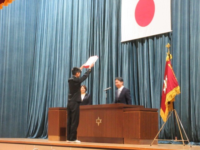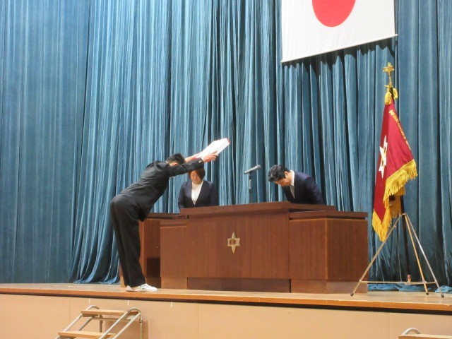 3月12日(水)育友会記念品授与式 公開日 2025/03/12 更新日 2025/03/12 第3学年 育友会長様から、代表生徒に卒業記念品として証書ホルダーを授与していただきました。明日の式で使います。ありがとうございました。