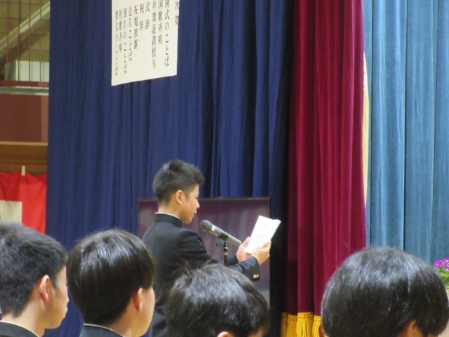 卒業生代表による「別れのことば」の様子です。卒業生は、涙をこらえながらの合唱でした。