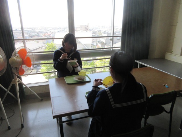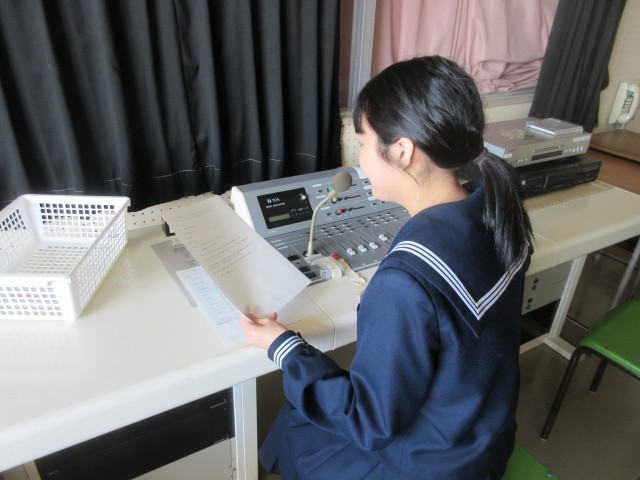 放送室では、委員が給食を食べながら、お知らせを放送していました。