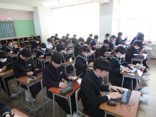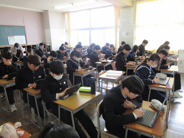 3限目。3年生は全国学力学習状況調査の理科に取り組みました。今年はオンライン方式での実施となりました。生徒たちは真剣に解いていました。