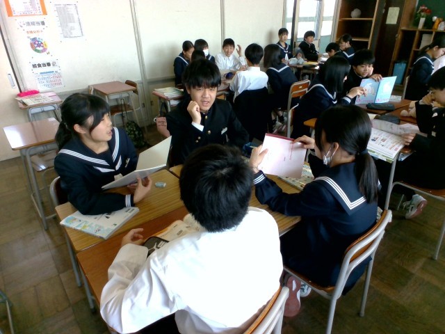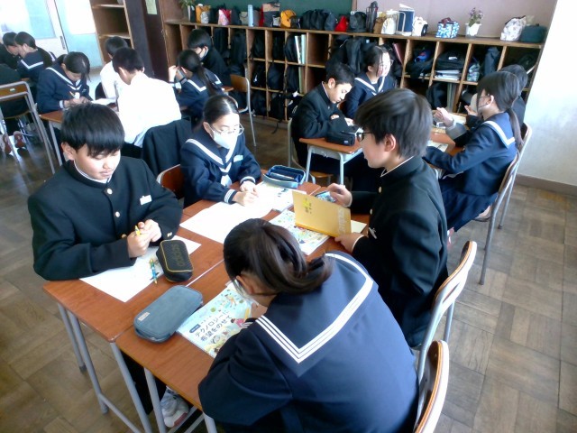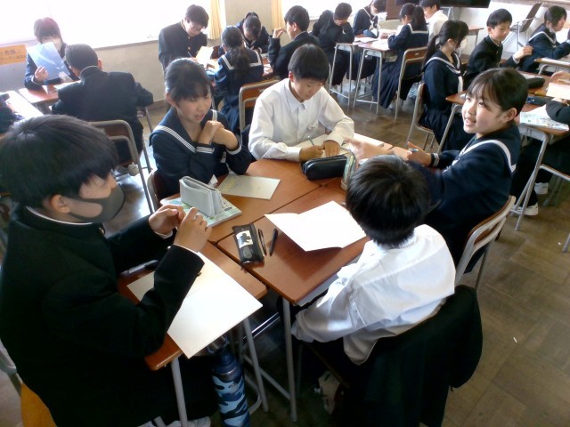 技術・家庭科(技術分野)では、「100年後にどのような製品が誕生しているのだろうか」を4人班で意見交換しました。未来が楽しみですね。