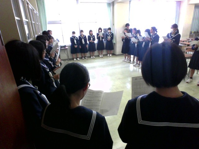 音楽では、平和記念公園で歌う「平和の鐘」を練習しています。今日は、1組と2組合同練習会でした。