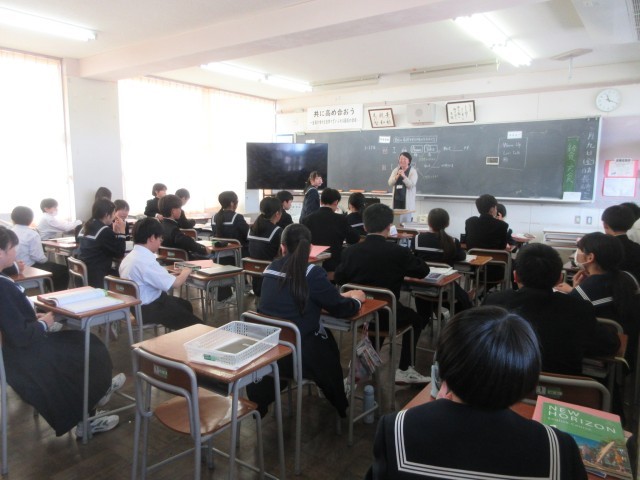 3組は英語。授業の終わり、ふり返って挨拶をするところです。