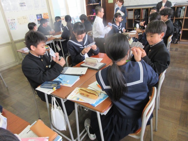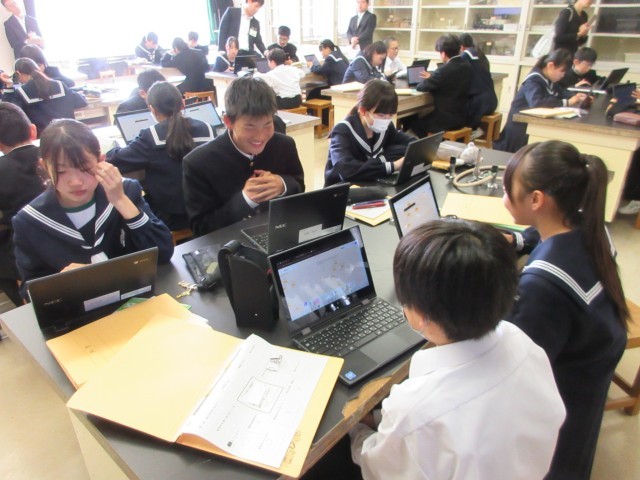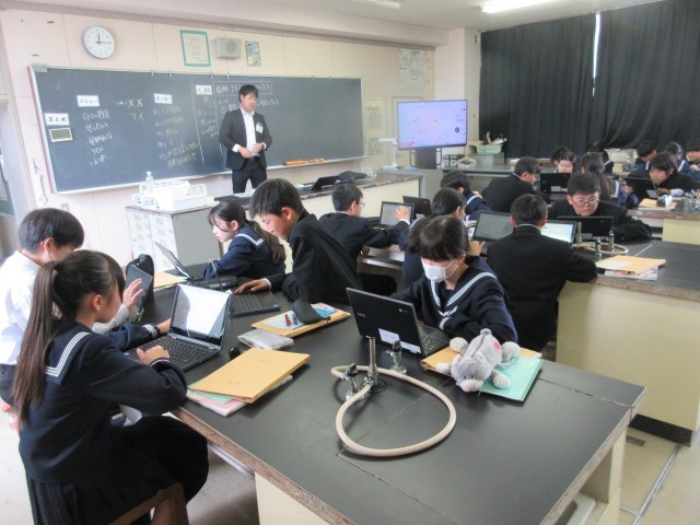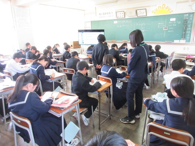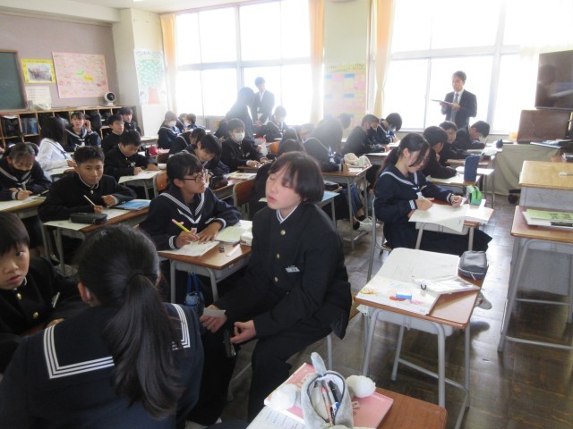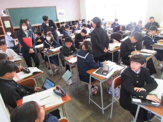 1年生の授業風景です。1組は英語。2組は国語。3組は数学、理科です。一人で考える場面、グループで話し合う場面、それぞれ意欲的に取り組んでいます。