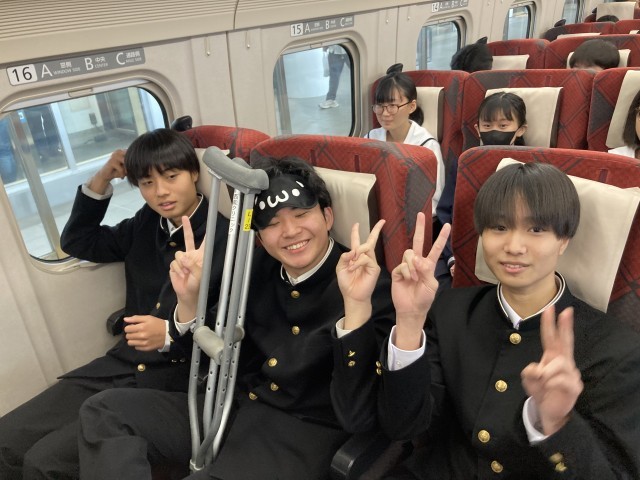 新幹線つるぎ号は敦賀に向かって富山駅を出発。生徒たちはワクワクいっぱいで笑顔があふれています。