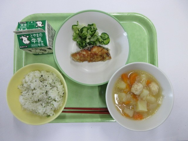 5月14日(水)今日の給食 公開日 2025/05/14 更新日 2025/05/14 給食 今日の献立は、菜めし、牛乳あじのから揚げ きざみ和え和風ポトフ です。和風ポトフには、野菜の旨みがしみこんでいました。