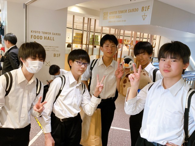 5月14日(水)修学旅行 京都 公開日 2025/05/14 更新日 2025/05/14 第3学年 班別学習の残り時間が少なくなってきたので、集合場所に近い京都タワーを訪れている班が増えてきました。女子がお土産を品定めしている時間、店から出ている3組男子たちです。