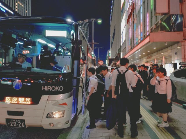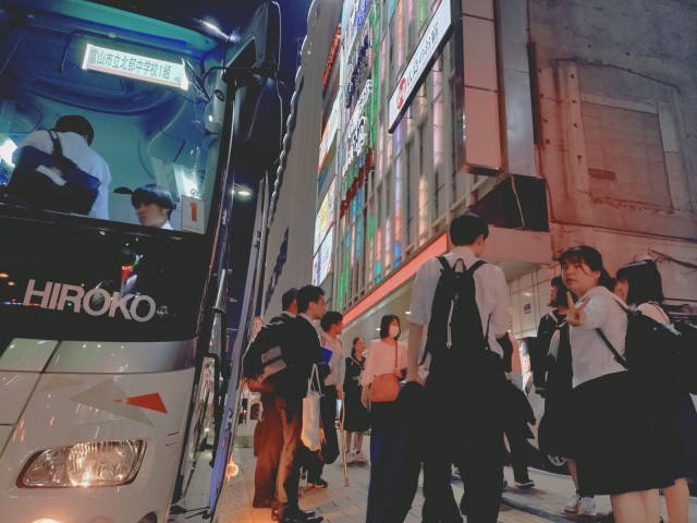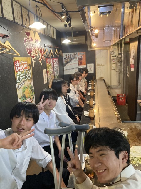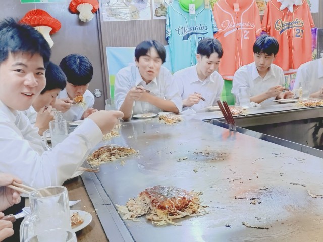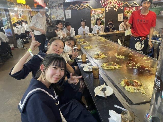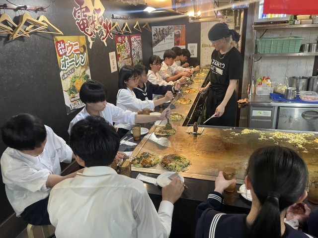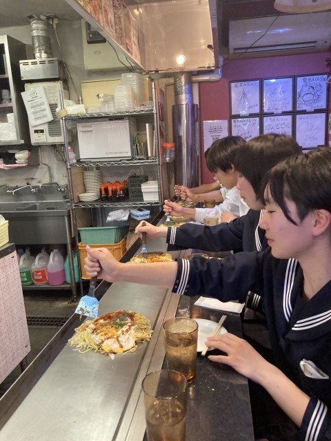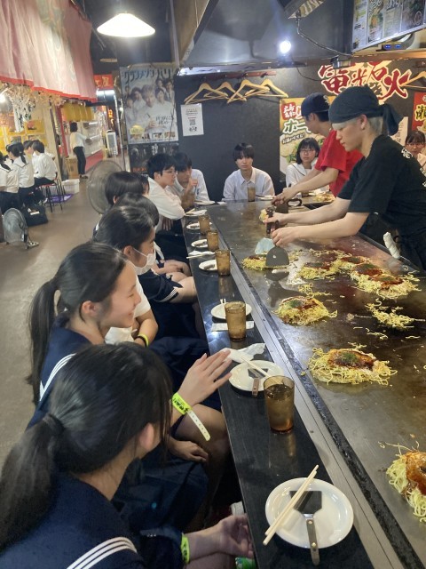 店員さんと楽しい会話をしながらの食事。地元の人はヘラだけで食べるそうで、教えてもらいながら挑戦する生徒もいました。