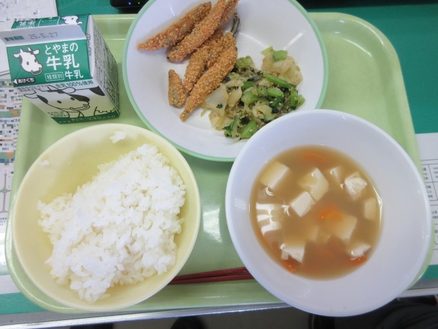 5月20日(火)今日の給食 公開日 2025/05/20 更新日 2025/05/20 給食 今日の献立は、ごはん、牛乳きびなごのさくさく揚げごまびたし白玉汁 です。きびなごのさくさく揚げはいつも人気です。