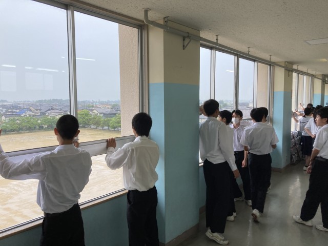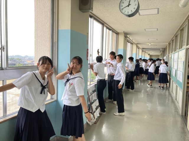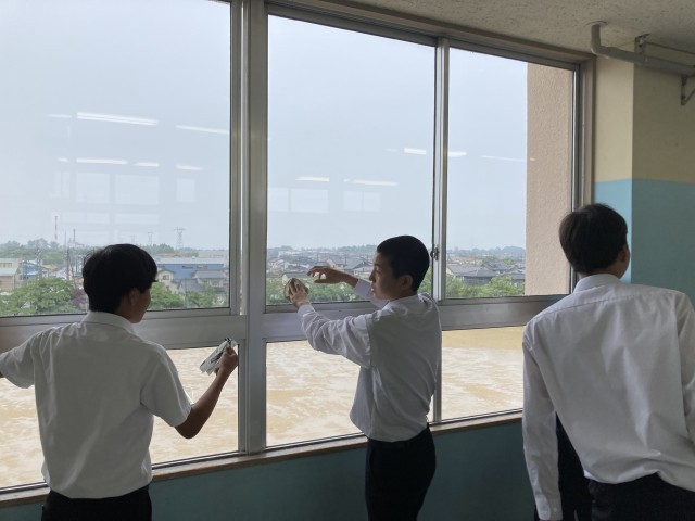 給食時の放送の呼びかけで、たくさんに生徒が昼休みに窓ふきを行いました。
