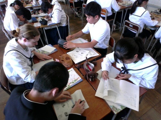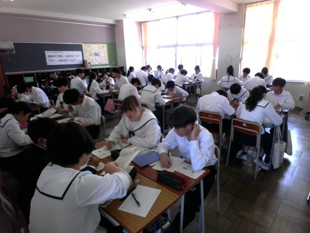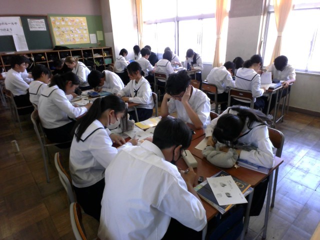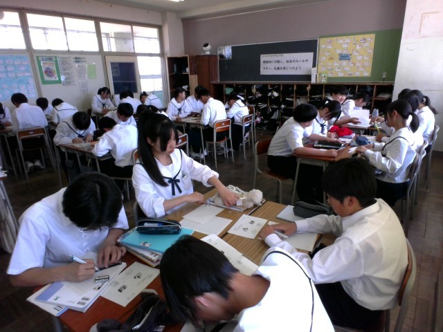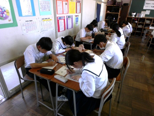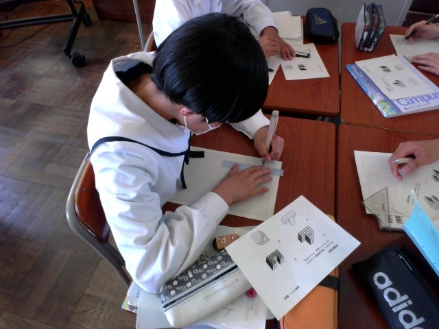 技術・家庭科(技術分野)では、製図を学習しています。今日は、等角図をマスターするために4人班で教え合いをしていました。次回、技能テストです。