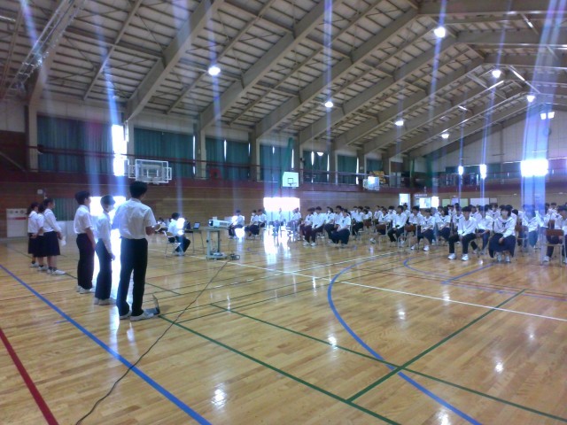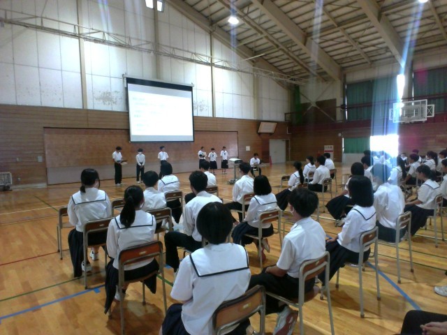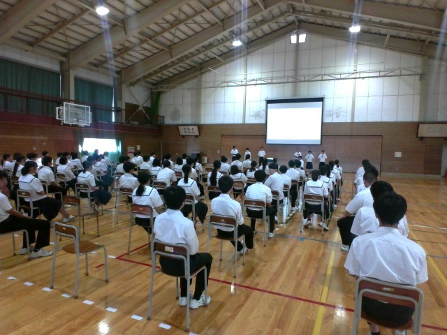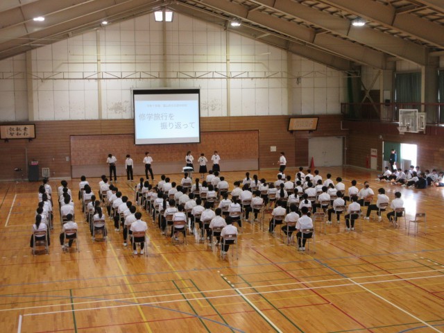 修学旅行の振り返り集会がありました。級長と班長がアンケート結果や活動の様子をもとに、行動面について、振り返りを発表しました。学校生活をよりよいものにするために、経験を生かしていきます。