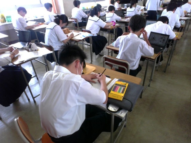 美術科では、ポスターの制作をしています。今日の授業でアイデアスケッチを完成させます。なかには本番の制作に取り組んでいる生徒もいます。完成が楽しみです。