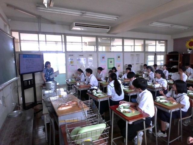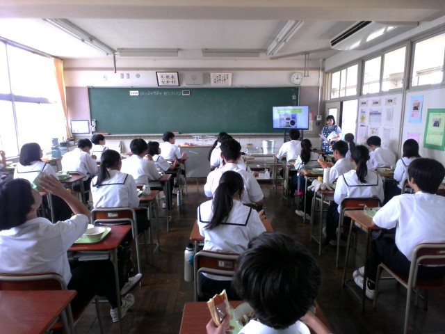 今日は、富山市北学校給食センターの職員であり、本校の栄養職員、栄養教諭である2人が、給食、そして給食センターの役割について、3年生に向けて話をしました。給食には多くの方々がかかわり、栄養のことや食の安全に取り組んでいることなど、生徒たちはふだん聞くことができない貴重な話に耳を傾けていました。
