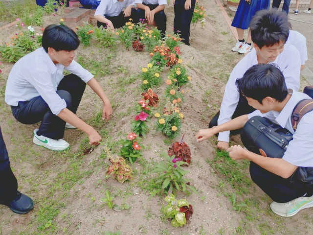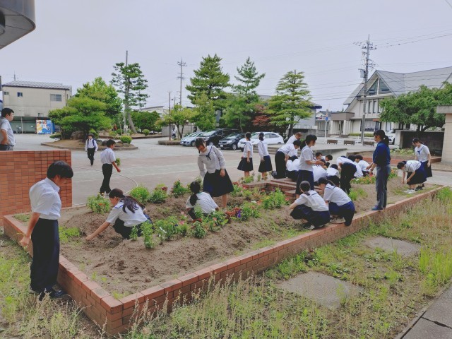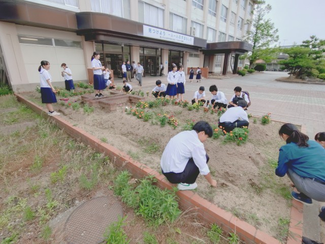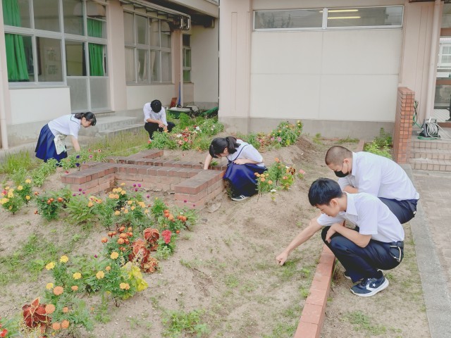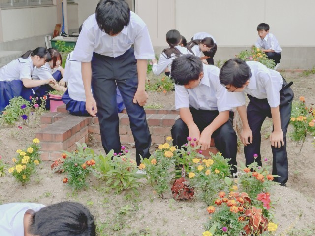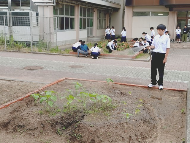これまで朝のボランティア等に参加していなかった3年の生徒たちがたくさん参加して、花壇の草むしりをしていました。