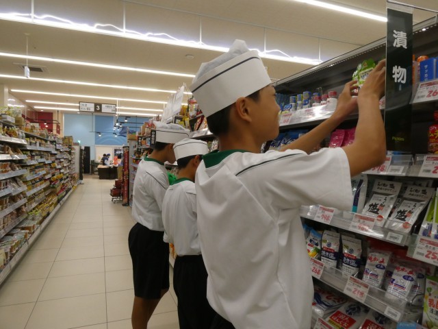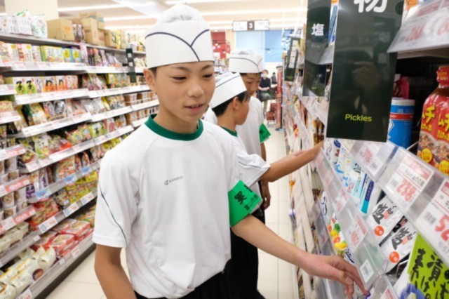 「(株)バロー 北の森店」では、商品の棚だし作業を行っていました。ちょうど、「月光堂フォート」で体験している生徒が取材に来て撮影していました。