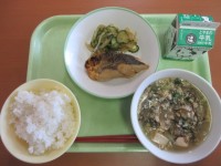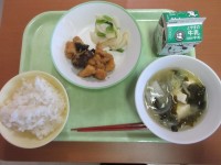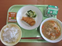 今日の献立は、ごはん、牛乳ホキの竜田揚げ、チンゲンサイひたし厚揚げのそぼろ煮、大...