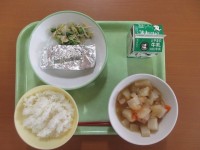今日の献立は、ごはん、牛乳大豆のみそからめ、ゆかり和え、かぶと肉団子のポトフ で...