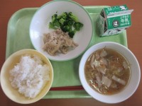 今日の献立は、ごはん、牛乳、鶏つくね、野菜炒め、豚汁 です。豚汁はとても温かくて...