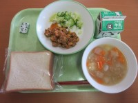 今日の献立は、食パン、牛乳チリコンカン、そえ野菜野菜のスープ煮、ポケットチーズ ...