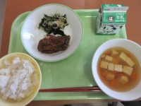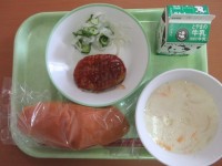 今日の献立は、コッペパン、牛乳ハンバーグのケチャップかけ大根サラダ、クリームスー...