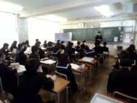 1年授業風景です。1組は音楽。アルトリコーダーの練習をしています。2組は理科。いろいろな鉱物の特徴についてスライドを見ながらノートにまとめています。3組は数学。立体の分類の仕方について学習しています。
